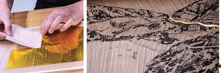 Artisans used 24-carat gold leaves (L) to depict roads on the map section. The ‘road’ (R) is precision-cut and inlaid within the marquetry composition.