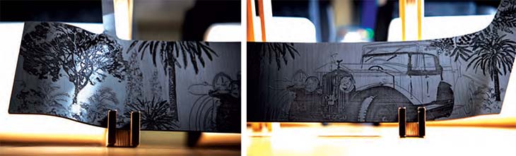 To create a textured wood sculpture that “captures places, moments and journeys” that have shaped over the Phantom’s lifespan, each composition is crafted in Blackwood veneer. The scenes are first sketched by hand, then translated into digital form and recreated in wood.
