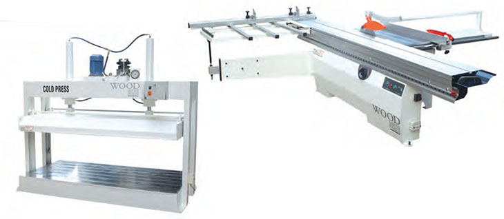 Hot/cold presses (L) are employed for laminating plywood and MDF with decorative sheets. Panel saws (R) are used to cut large boards with precision into smaller panels.